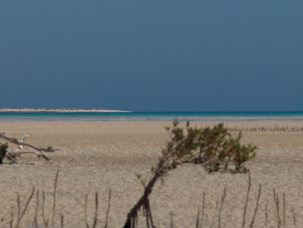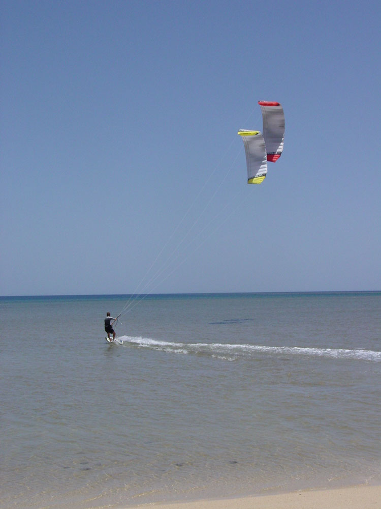 Der Stehbereich ist „richtig“ gross, also auch nicht zu riesig, das man bei Ebbe zu weit zu gehen hat, und ist fast Stein und völlig Korallenfrei. Zum im Internet bekannten und beworbenen Camel Beach sind es nur 10 Km. Die Surfstation kümmert sich um die Permits, bitte schon bei der Buchung angeben, es muss schliesslich auch ein Auto beschafft werden. Der Camel Beach ist ein ca 2km² grosser Stehbereich mit schönem, konstanten Wind mit der Windrichtung: Sideshore bis leicht Sideonshore, einer Mangrovenansammlung im Luv und einem ca 150 Meter breiten Kanal in den Mangroven, perfekt zum cruisen. Eine kleine Mangroveninsel ist ca. 600 Meter vom Ufer entfernt. Zwei vorgelagerte Inseln in einer Entfernung von ca. 3 Kilometern zum Strand, der Stehbereich ist durch ein Aussenriff (Entfernung vom Strand ca. 2km) vor Wellengang geschützt. Der Boden im Stehbereich ist aus superfeinem Sand, leider mit ein paar Muschelbeimengungen. Der Camel Beach ist auf jeden Fall einen Ausflug wert, es gibt Angebote, die eine Woche Schulung dort anbieten, ich halte das für übertrieben, die Schüler können am Anfang ja eh nur in den Schirm schauen und haben nichts vom der Landschaft.