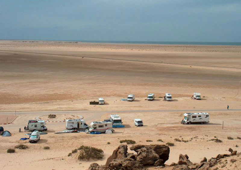 Die Reise dauerte von Mitte Dezember 2004 bis Ende Januar 2005. Die Gesamtfahrtstrecke betrug rund 11800km. Davon 3000 bis Tarifa, dann 800km bis Agadir plus 1200km nach Dakhla. Also ca. 5000km Berlin – Dakhla! Der T4, 75KW TDI hat klasse durchgehalten, ich empfehle aber dringend wegen der in der Sahara auftretenden Sandstürme einen Ersatzlüftfilter mitzunehmen. Den habe ich auch nach 2x ausklopfen benötigt. Die überzähligen 1800km waren Sightseeing zu Städten wie El Jadidda, Casablanca, Tarhazoute, Agadir, Essouira, Moulay, Marakesch, Meknes und ein bisschen durch Tanger. Ich empfehle auf jeden Fall auf der Hin- oder Rücktour den Weg über Marakesch mit seinem sehr schönen und interessanten Markt zu machen. Auf dem Hinweg sind wir die mautpflichtige Strecke über Lyon, Dyon, Barcelona gefahren (wir wollten ja ankommen), auf dem Rückweg sollte die billigere Strecke über Madrid, Paris angesagt sein. Leider war ende Januar Nordspanien zugeschneit, so das wir das abhaken mussten. Bis Tarifa hatten wir also ca. 450.- Sprit und Maut gebraucht. Die Fähre Tarifa – Tanger (am ersten Tag wegen 9 BFT nicht nutzbar) kostet 300.- hin und zurück. Das wäre (hinterher ist man schlauer) bei „CARLOS“ in Algeciras am Hafen auch für 240.- gegangen. Von Tanger bis Boujodur kostet der Diesel in Marokko -.60 , tiefer im Süden dann -,30.
