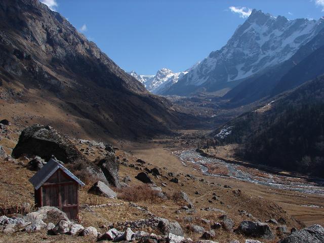 Am naechsten Tag steht Har-Ki-Dun und zurueck nach Osla auf dem Plan. Von 2.500m auf 3.500m, 23km, bergauf, bergab. Der Weg ist traumhaft. Hoch ueberm kristallklaren Fluss mit gigantischen Blicken zurueck ins Tal und nach vorne auf schneebedeckte 6.000er Riesen. Auf unserem dreistuendigen Weg treffen wir nur ein paar Schaefer. Ihre Hunde tragen 20cm breite Metallhalsbaender, um sie vor Leopardenangriffen zu schuetzen. Har-Ki-Dun ist ein Platz nur ein Stueck ueber dem Fluss, eingerahmt von massiven Gletschern. Ein paar Huettchen sorgen fuer Alpenidylle. Wie gerne wuerden wir hier noch etwas bleiben. Aber langsam kriecht die Kaelte in unsere Knochen. Wir wandern zurueck ins Dorf und koennen zuschauen, wie die Kinder Schafe und Ziegen nach Hause treiben. Was fuer eine Zeitreise.