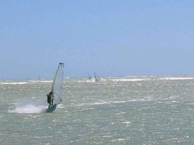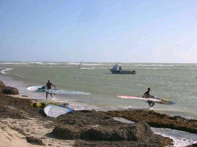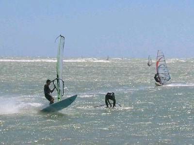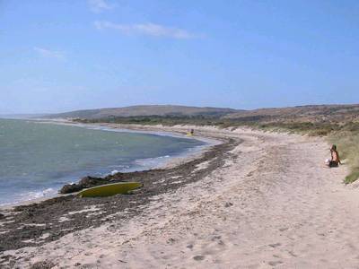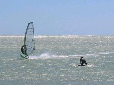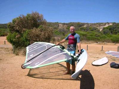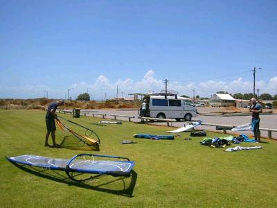 4. Coronation Beach, etwa 17 km (Schotterpiste) nördlich von Geraldton – der Topspot. Im vorderen Bereich Flachwasser, ca. 300 Meter weiter draussen brechen die Wellen ueber ein Sandriff. Absolut sicher (da Sand), perfekte Wellen zum Springen, nicht schlecht zum Abreiten. Leider gibt es keine Wiese zum Aufriggen oder sonstige Annehmlichkeiten. Grosser Parkplatz, auf dem man gegen geringe Gebuehr (Ranger) wohl auch Campen darf. Man muss allerdings sein Wasser selbst mitbringen, es gibt nur eine Busch-Dunny.