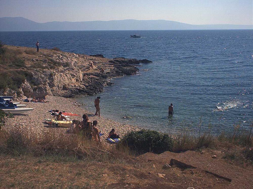 Startplatz auf dem Campingplatz, 2 kleine Kiesbuchten mit vielen Steinen, zur Hauptsaison nahezu unmöglich über die Strandgäste weg ins Wasser zu kommen. Bora etwas schwächer als in Rabac und eine chaotische Welle, bedingt durch Reflexion an der Steilküste. Bei schönem Wetter ohne Bora kommt nachmittags ein Thermikwind mit 3 bis gute 4Bft, kleine Welle genau mit dem Wind.