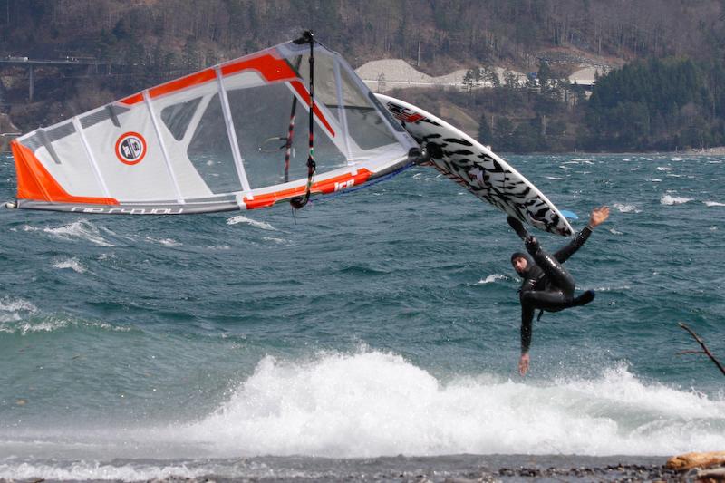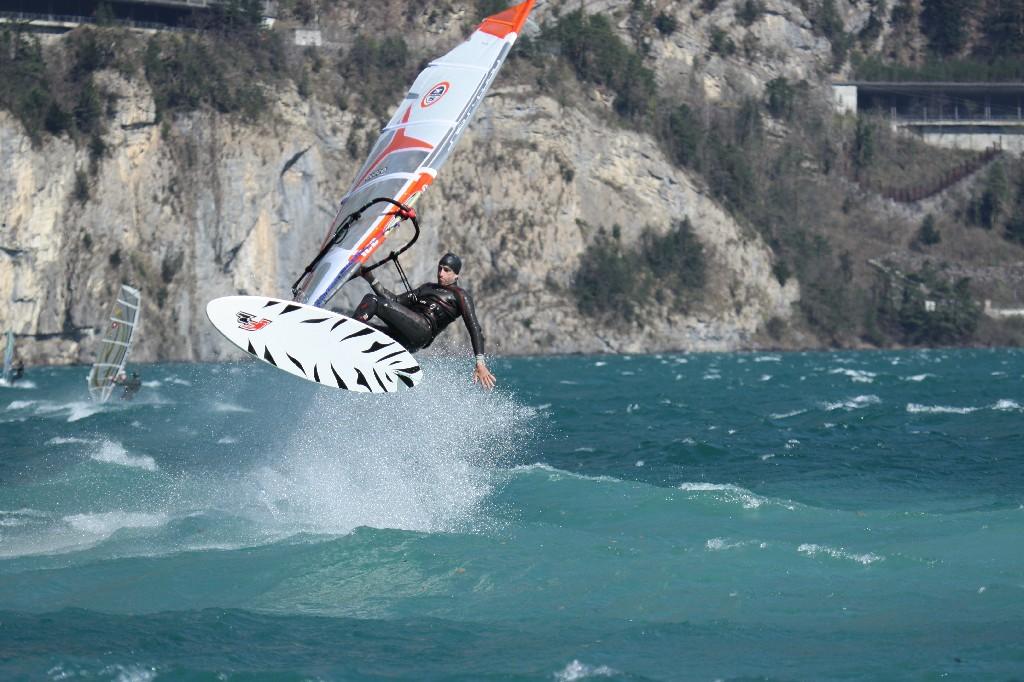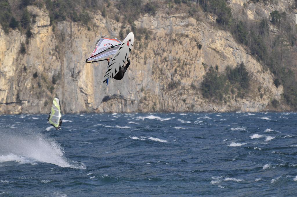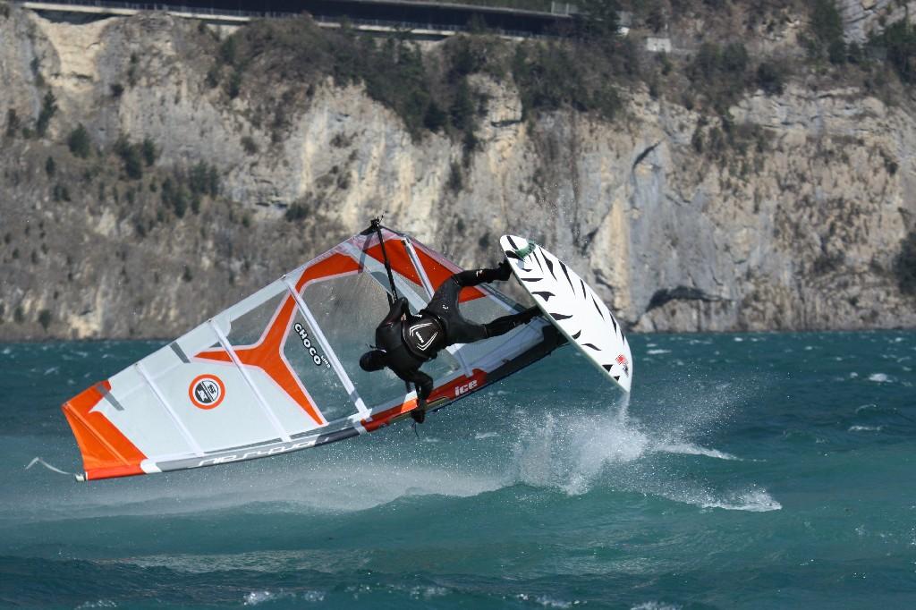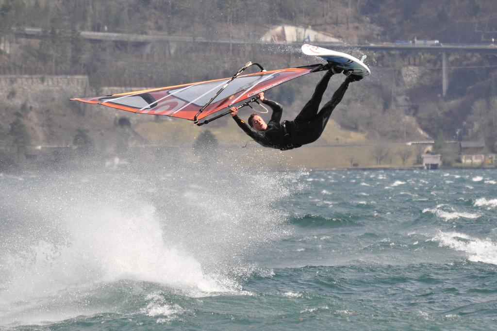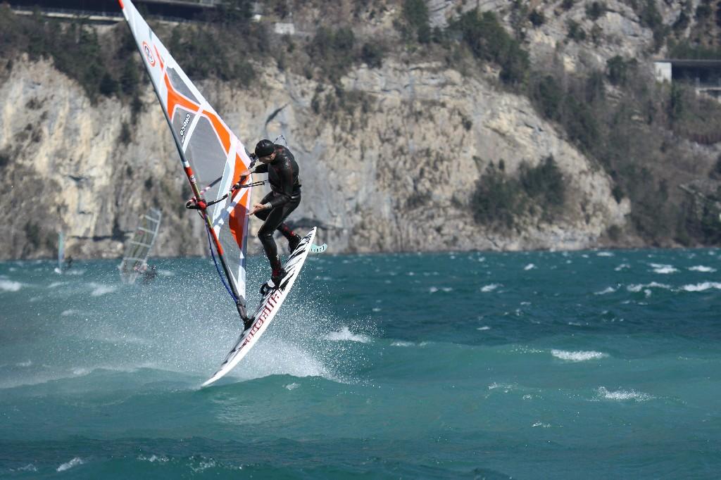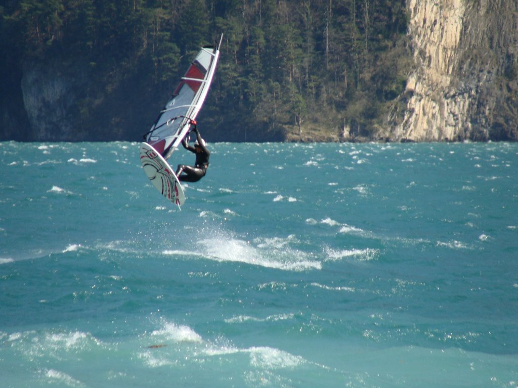 Winde: Föhn, Föhnbise, Bise, Thermik, Nordwestwind und Westwind. Hier bin ich fast das ganze Jahr anzutreffen, wenn es Wind hat. Dieser Spot funktioniert bei fast allen Winden am Urnersee. Es ist ein sehr idyllischer Ort mit einer kleinen Halbinsel aus Kies (das Delta des Isenthalerbachs). Es hat auch einen grossen Strand mit Liegewiese. Eigentlich ist es dort verboten, das „Windsurfbrett zu wassern“. Das ist weiter nicht schlimm, denn ein Start gelingt hier sowieso nur bei Föhn. Bei Föhn aber wird der Strand nur von Windsurfern benützt. Es hat einen ziemlich grossen Parkplatz beim Restaurant. Achtung! Die Polizei ist gar nicht surferfreundlich. Wenn der Föhn wütet und alle Parkplätze besetzt sind (oft schon früh morgens), sollte man ja nicht auf dem Trottoir parkieren, sonst riskiert eine Busse. Der Föhn kommt am „Inselchen“ sideshore von rechts und ist ziemlich konstant, sicher konstanter als an allen anderen Orten des Urnersees. Die Thermik entsteht hier meistens gegen 13-15 Uhr. Für diesen Wind braucht es hier Segel um die 7m². Der Wind ist am stärksten auf der anderen Seite des Sees unter den grossen Felsen des Axen. Dort kann man dann schon ein 6m² Segel fahren. Aber der Wind ist für jene, die noch nie dort gesurft sind, ziemlich seltsam. Als ich das erste Mal dort surfte, gelang mir kein Wasserstart, weil ich nie wusste woher der Wind kommt! Achtung! Genug früh an die Isleten zurückfahren, sonst hat man eine Schwimmsession sicher (ich rede aus Erfahrung). Abends kommt ein schwacher Wind aus dem Isenthal und weht ablandig. Er hat höchstens 1-2 Windstärken, aber das kann reichen, dass man nicht mehr zurückfahren kann. West- und Nordwestwind kommen hier auch sideshore von links, sie bringen manchmal schöne Chops mit. Aber man muss schon fast hier wohnen, um diese Winde zu erwischen, denn auf sie zu spekulieren, ist ziemlich schwierig.