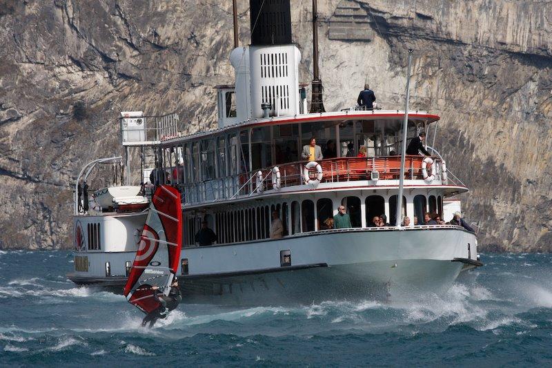2. Föhnbise kündigt den Föhn an. Sie dauert eine bis mehrere Stunden, ist recht konstant und kann bis zu 5 Beaufort stark werden. Wenn sie sehr stark ist, wird auch der Föhn sehr stark! Achtung: der Föhn kann plötzlich einfallen! Und dann ist man mit den meist zu grossen Segel von der Föhnbise ziemlich am (Arsch)! Zu erkennen ist der Föhn an einer markanten grünen Linie auf dem Wasser. Man sollte dann auch die Segel in Sicherheit bringen, denn beim Wechsel vom der Richtung des Windes um 180 Grad ist schon manches Segel im Gebüsch gelandet!