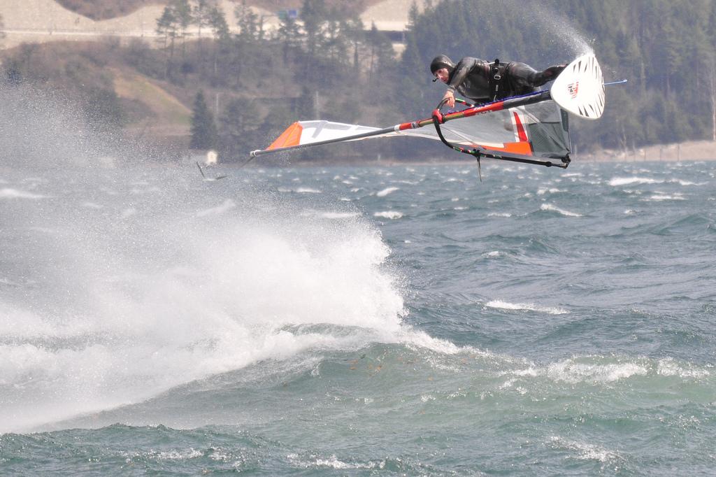 3. Thermischer Wind bläst aus Norden. Er tritt nur an sonnigen Tagen im Frühling und Sommer auf. Im Herbst ist er sehr unzuverlässig. Sein Ursprung sind die sich stark aufheizenden Felsen am Ufer des Sees (wie beim Gardasee). Meist sind es so um die 2-4 Windstärken! Man kann froh sein, wenn die Thermik einmal eine Stärke von 5 Beaufort bekommt.