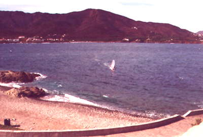 Es gibt zwei Spots in der Bucht die gute Sideshore-Bedingungen bieten. Der erste liegt an der ersten Hafenmole am Ende des Strandes. Man kann dort direkt an der Strandpromenade parken und aufriggen. Dieser Spot ist besonders für die Welleneinsteiger geeignet, da man am Strand entlang der Mole rauskommt (flaches Wasser und stehtief bis zur Spitze der Mole). Hinter der Mole geht’s dann zur Sache, und wer abtreibt, landet 200…300m entfernt am Sandstrand am Ende der Bucht, kann ‚Höhelaufen‘, und sich erneut in die Wellen stürzen. Einziges Manko ist die Abdeckung bei Mistral (ca. NO) durch die Hafengebäude.