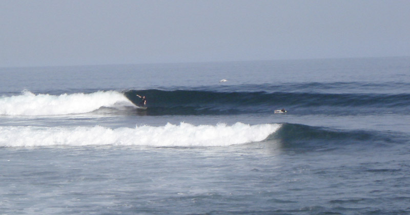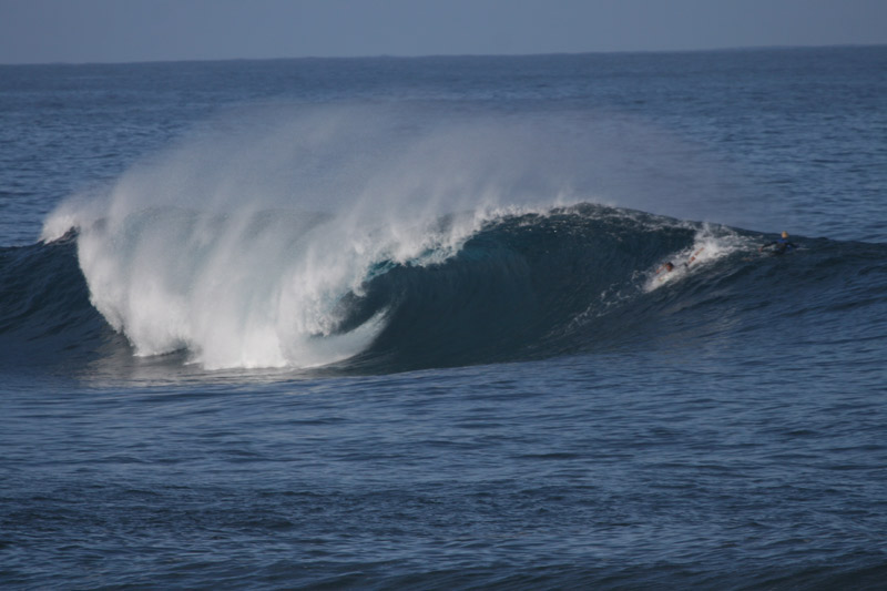 In der Mitte der Bucht gibt es noch eine langsame Insidewelle, die sich sowohl von der rechten als auch der linken Welle speist, aufbaut und dann nach links bricht. Die Welle ist gut geeignet für die ersten Riffversuche, die Stimmung entspannt, die Welle einfach. Sie bricht schon bei 3 Fuss und kann durchaus bis 6-7 Fuss halten. Fun! Swell aus West bis Nord und der Wind ist am besten bei allem um Ost rum. Gezeit am Besten auflaufend, aber es geht alles. Bei lowtide beachte den Stein in der Takeoff Zone. Bei ablaufend achte darauf wo du hinströmst 😉