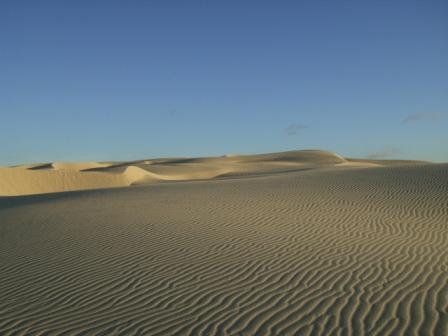 Der Wind kommt hier konstant Sideshore von rechts. Wir sind in den zwei Wochen jeden Tag kiten gewesen, abwechselnd 9er und 12er Kites, nur ein Tag mit dem 17er. Die Natur ist Zeuge von dem konstanten kräftigen Wind. Riesige Dünen und der in Windrichtung gewachsene Bäume sind der Beweis. Beste Windzeit ist von September bis Dezember.